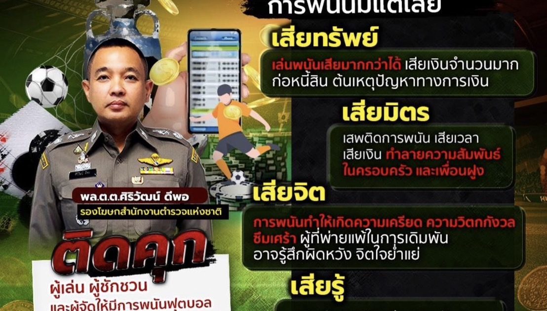 สำนักงานตำรวจแห่งชาติจึงขอให้พี่น้องประชาชนรับชมการแข่งขันฟุตบอลอย่างสร้างสรรค์ อย่าหลงผิดไปเล่นพนันฟุตบอล เพราะผลเสียที่จะตามมานั้นมีมากมาย เช่น
