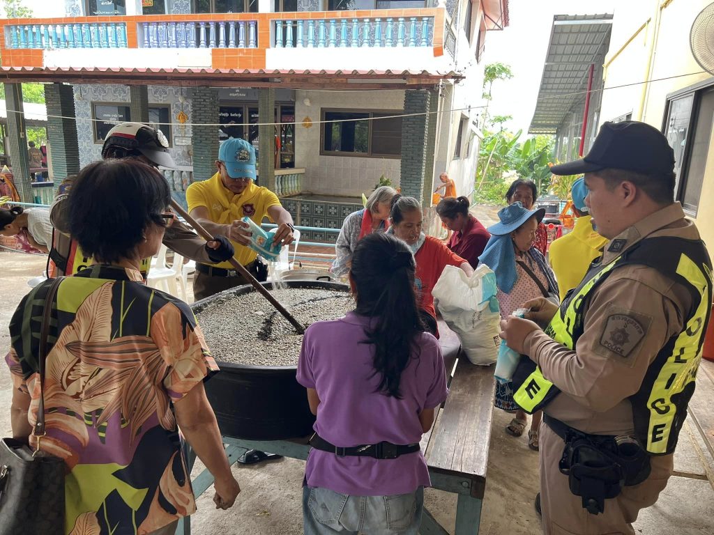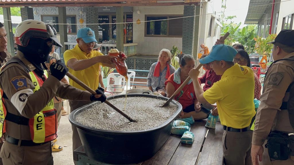 ร่วมกิจกรรมพิธี กวนข้าวทิพย์ ซึ่งเป็นพิธีสำคัญทางศาสนา ร่วมกับผู้นำชุมชน และชาวบ้านหมู่ที่ 9 ต.เนินกุ่ม