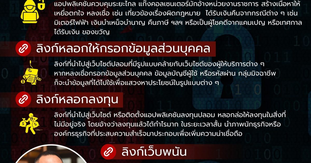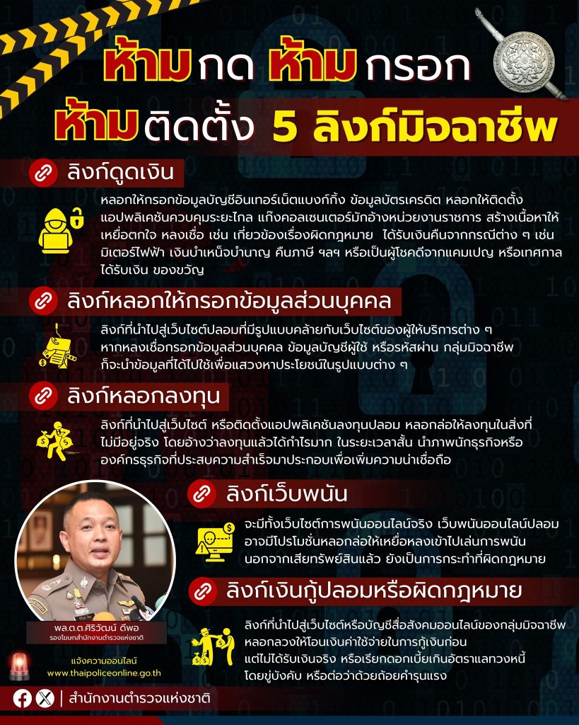 พล.ต.ต.ศิริวัฒน์ ดีพอ รองโฆษกสำนักงานตำรวจแห่งชาติ เตือนภัยออนไลน์ ด้วยพล.ต.อ.ต่อศักดิ์ สุขวิมล ผบ.ตร. ได้มีความห่วงใยพี่น้องประชาชนที่อาจได้รับความเสียหายจากอาชญากรรมรูปแบบต่าง ๆ ซึ่งในปัจจุบันกลุ่มมิจฉาชีพยังคงมีการพัฒนารูปแบบในการหลอกลวงพี่น้องประชาชนอยู่เสมอ มีการนำหลักจิตวิทยา “รัก โลภ ตกใจ เชื่อใจ” มาปรับใช้ในการหลอกล่อให้ผู้เสียหายหลงเชื่อ และมักพบว่ากลุ่มมิจฉาชีพจะมีการนำลิงก์รูปแบบต่าง ๆ มาใช้เป็นเครื่องมือในการกระทำความผิด ถ้าผู้เสียหายหลงเชื่อกดลิงก์ แล้วกรอกข้อมูลหรือติดตั้งแอปพลิเคชันจากลิงก์ดังกล่าว ก็จะตกเป็นเหยื่อของมิจฉาชีพในที่สุด