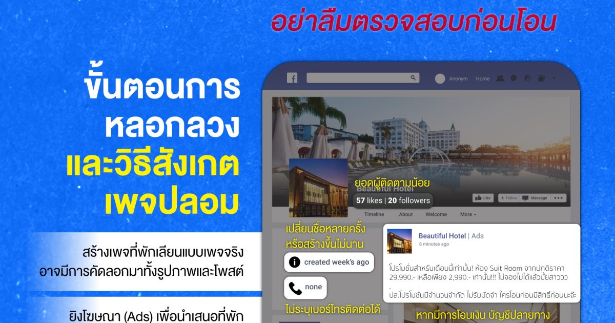 ในช่วงหยุดยาวที่ผ่านมานับว่าเป็น High season หรือช่วงที่ทุกคนวางแผนจองที่พักเผื่อเที่ยวในช่วงสิ้นปี – ต้นปี แต่ปัจจุบันพบว่ามีมิจฉาชีพรูปแบบใหม่ ที่แฝงมาในรูปแบบของเพจปลอม ทำให้ผู้เสียหายเกิดความเข้าใจผิด กดจองและโอนเงินเข้าบัญชีเพจปลอม นอกจากเสียเงินยังแล้ว ยังเสียเวลาที่ไม่ได้ที่พักตามที่จองอีกด้วย