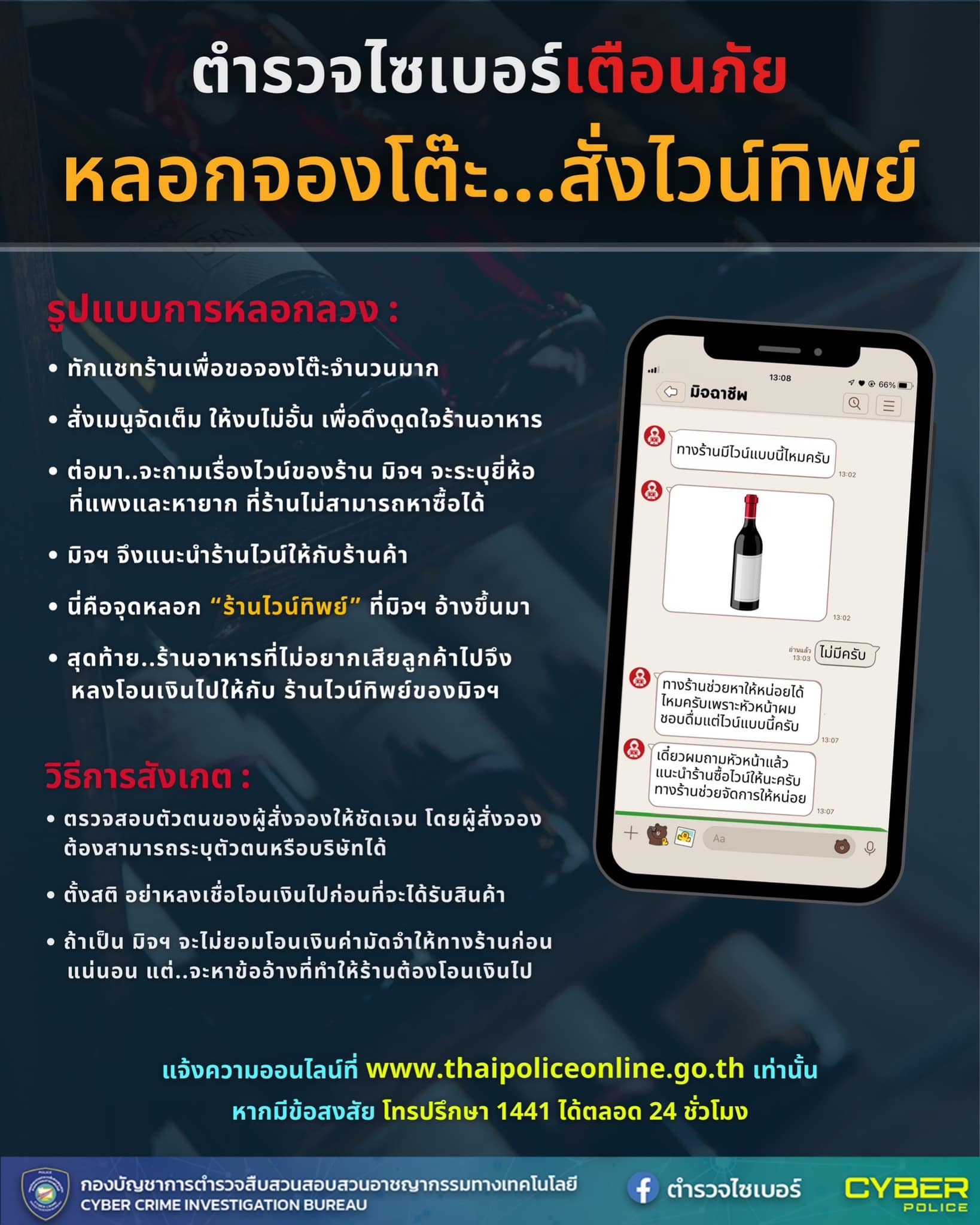 รูปแบบการหลอกลวง :1. มิจฉาชีพจะทักแชทของร้านอาหาร เพื่อขอจองโต๊ะจำนวนมาก2. สั่งเมนูจัดเต็ม ให้งบไม่อ
