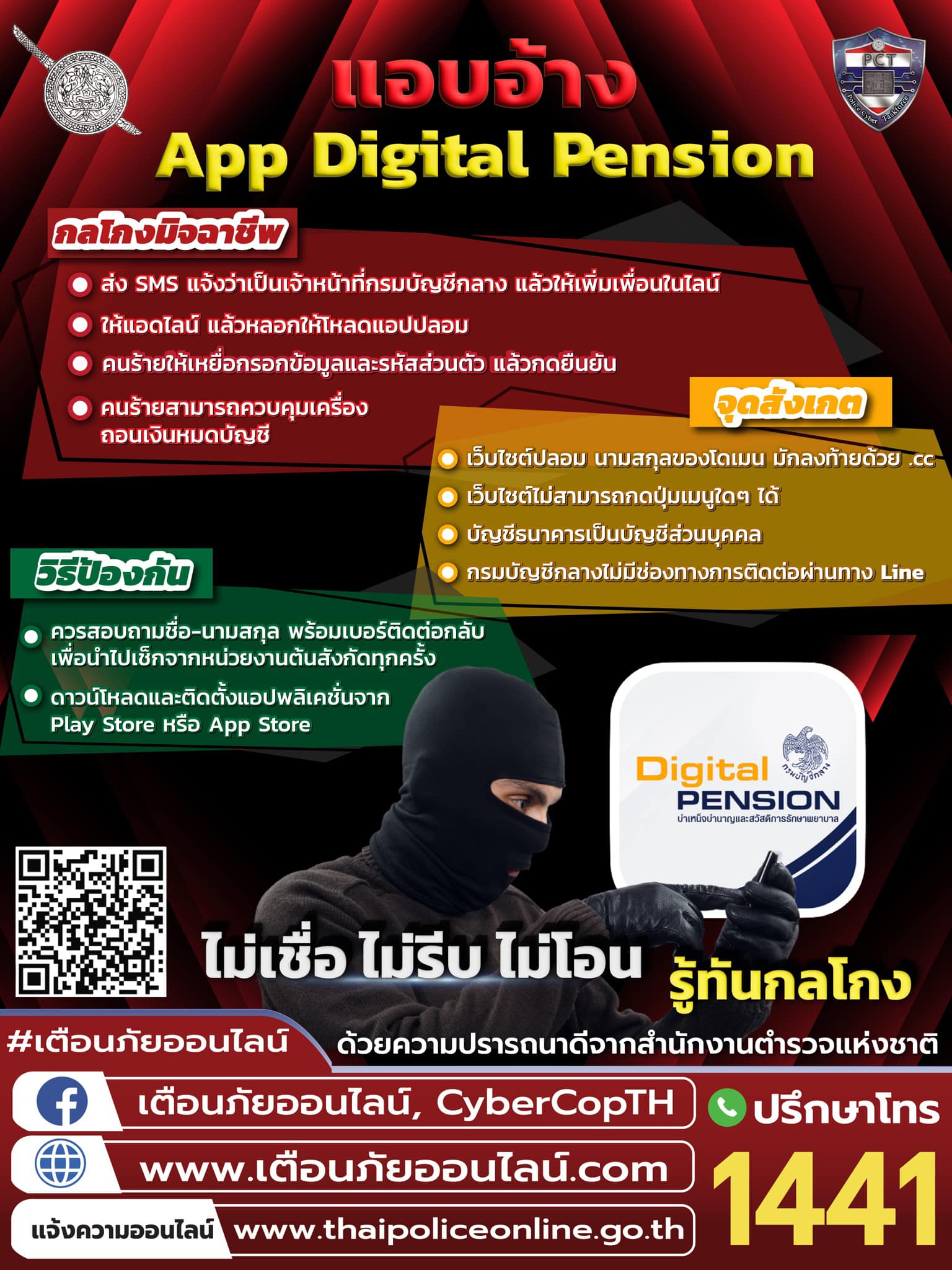 มิจฉาชีพแอบอ้าง App Digital Pensionหลอกติดตั้งแอปดูดเงิน โอนเกลี้ยงบัญชี.รูปแบบการหลอกลวง :1. ส่ง SM