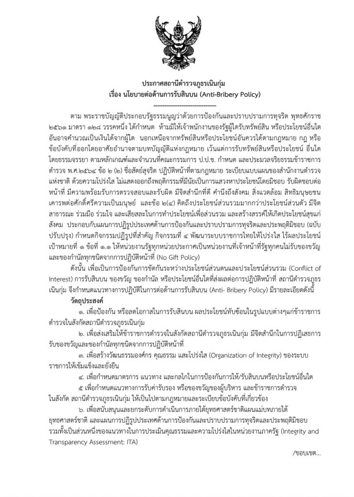 สถานีตำรวจภูธรเนินกุ่ม ขอประกาศนโยบายการต่อต้านการรับสินบน (Anti-Bribery Policy) โดย พ.ต.ท.วิเลิศ รุ่งโรจน์ สวญ.สภ.เนินกุ่ม และ ได้เผยแพร่ฉบับแปลเป็นภาษาอังกฤษควบคู่กับฉบับภาษาไทย มีรายละเอียด ด้านล่างนี้